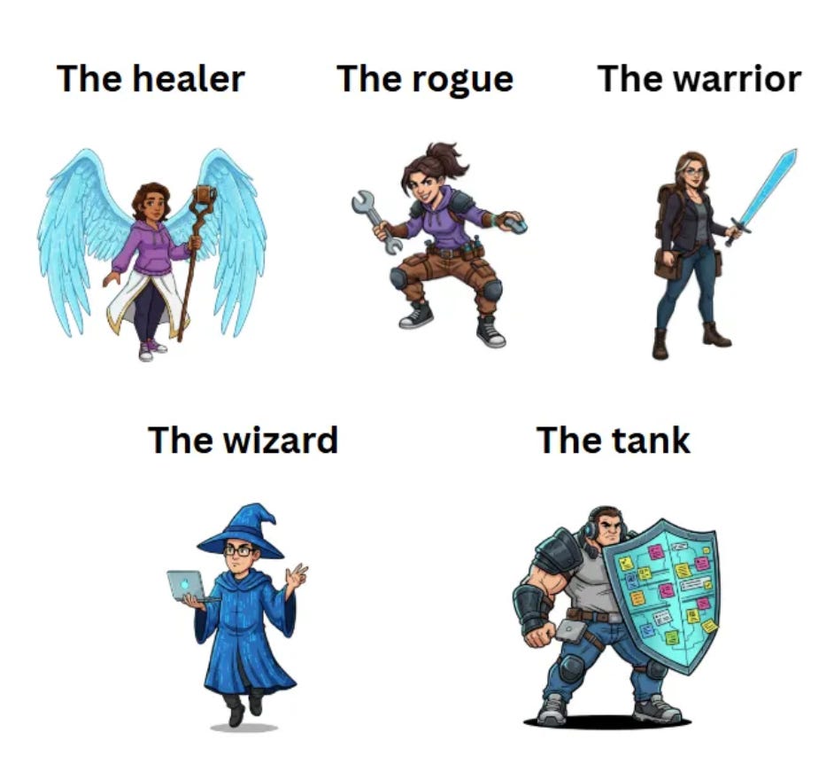 The warrior-tank-healer-wizard-rogue breakdown captures team dynamics brilliantly, where each archetype fills specific gaps that all-star collections miss. Warriors handle complexity, tanks deliver consistency, healers translate business needs, wizards design systems, and rogues adapt to whatever emerges.